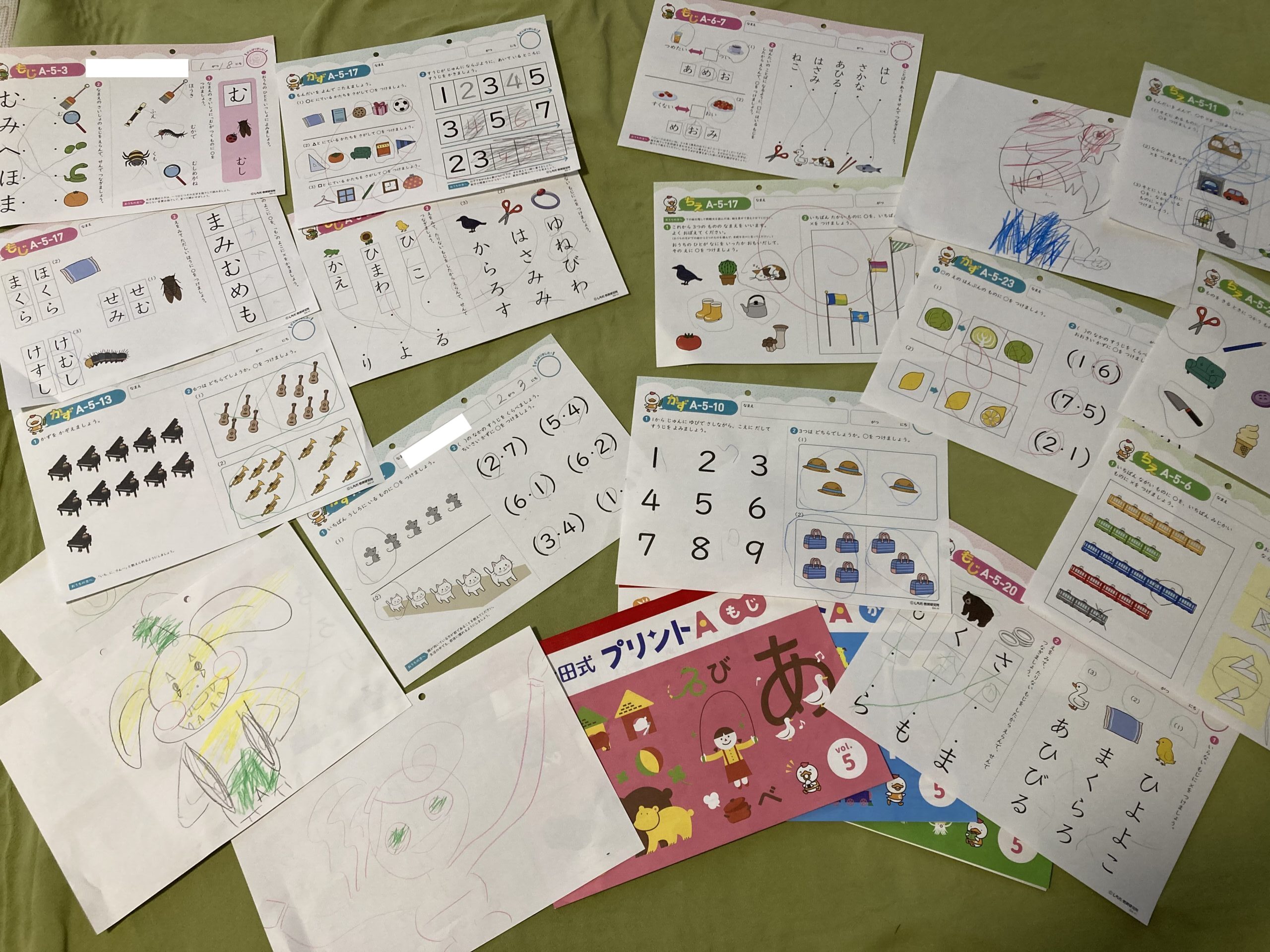 「3」~「5」の書き「1」~「40」の数字の読みや多い少ない/高い低い/長い短い/大きい小さいの判別1台2台、1匹2匹など数え方の練習だった。
