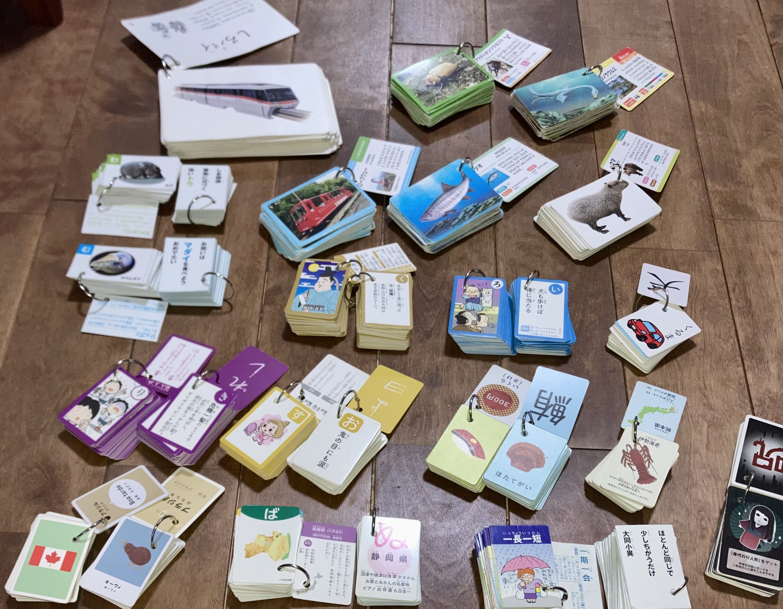 我が家は一人目の子が幼い時に数えきれないくらいカードをバラバラにされて片付けた微笑ましいような苦い思い出があるので全てのカードをリングに通した。